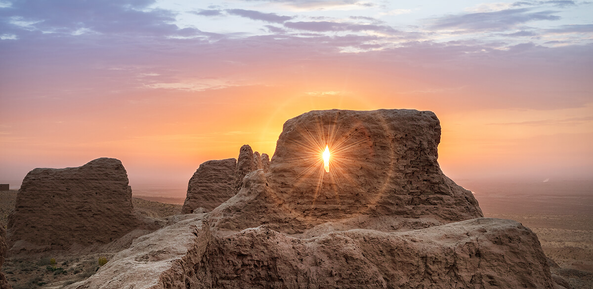 Breakfast at the hotel. Drive to Khiva via Toprak-kala and Ayaz-kala. On the way visit Chilpik-kala – «tower of silence», supposedly ritual constructions of pre-Islamic culture. Arrival to Toprak-kala -ancient settlement which was the capital of Khorezm in the III century AD. Then we’ll visit one of the largest fortresses of Ancient Khorezm – Ayaz-kala, II century AD, relevant to the period of Kushan Empire prosperity. Lunch at the yurt camp. Continue driving to Khiva. Arrival and hotel accommodation. Overnight in Khiva.